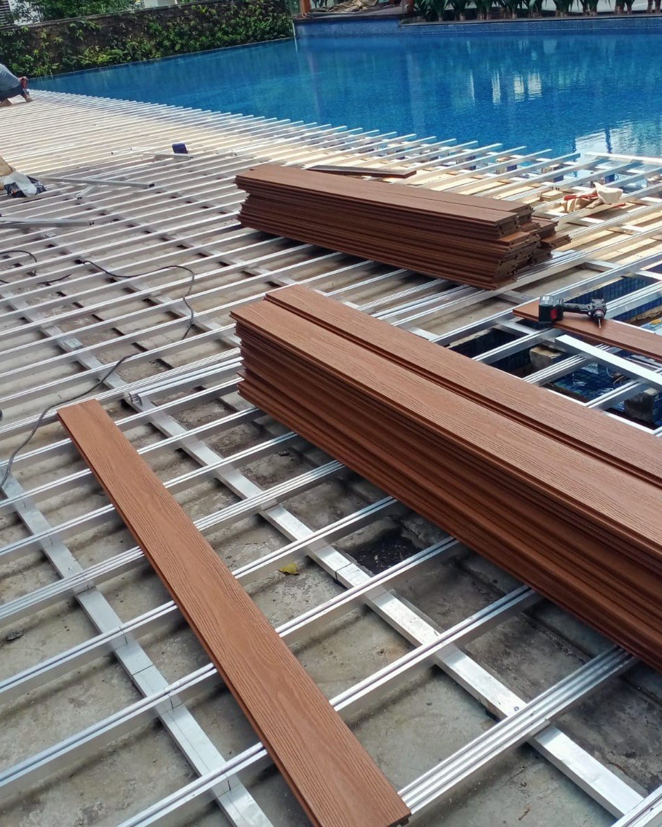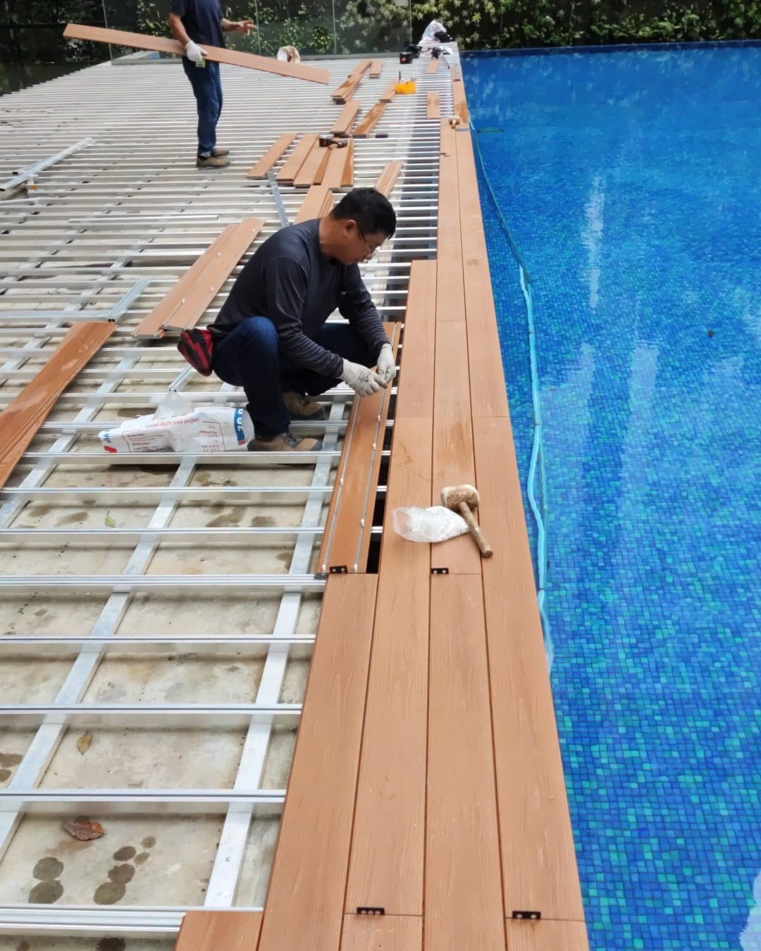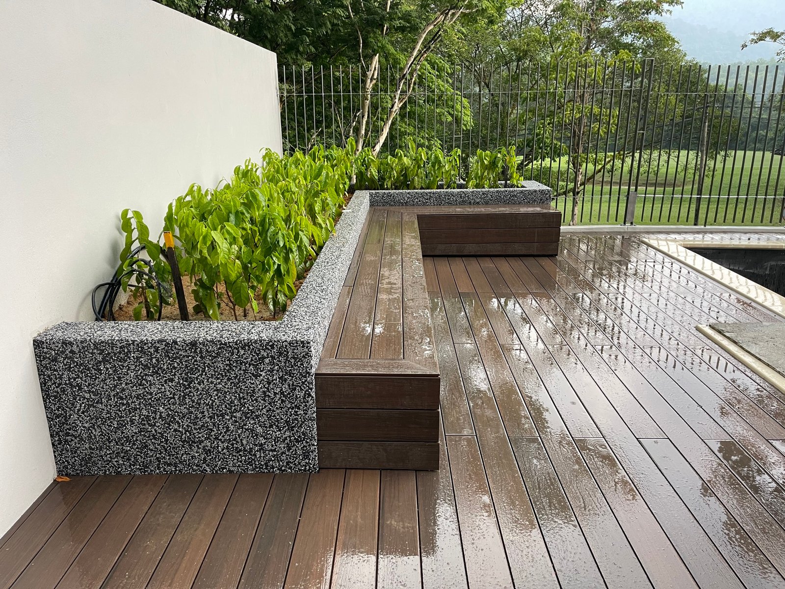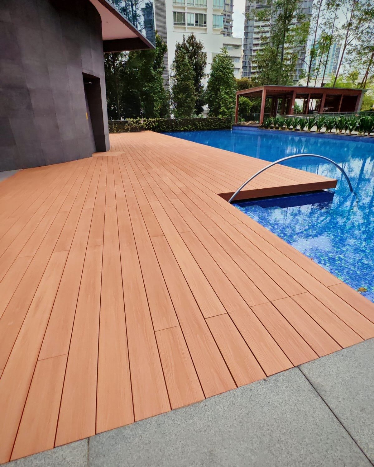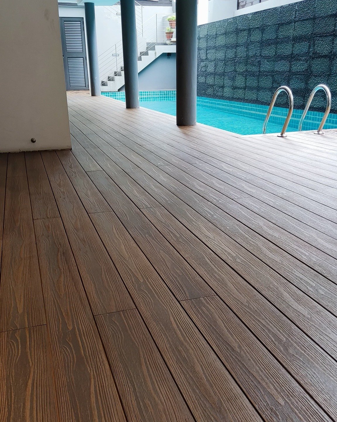 首先,它实现了真正的Exterwood防水地板。100% PVC 的基材完全不吸水,这便从根本上杜绝了传统 WPC 因吸湿而导致的膨胀、变形、滋生霉菌以及腐烂问题,使其成为名副其实的防潮防霉地台。其次,PGF 聚合玻璃纤维技术是其应对热带酷热的秘诀。这项技术赋予了 EcoR Deck 卓越的尺寸稳定性,即使在马来西亚炎热潮湿的极端气候下,也能将热胀冷缩的幅度降到最低,确保地台长期保持平整,是追求不开裂地板用户的理想之选。