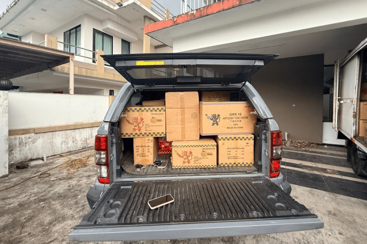 农历新年前夕,”新山烟花爆竹走私案”浮出水面,警方普通行动部队根据情报展开夜间突击,目标锁定士姑来皇后花园及丽宁镇的两处住宅。执法人员抵达现场时,发现其中一处半独立式洋房内堆满箱装烟花与爆竹,屋内几乎无生活用品,显示该处长期被用作临时仓库。嫌犯23岁的本地华裔男子在现场协助调查,警方还查扣了用于运输货品的罗厘及货卡,为进一步追踪走私链条提供重要线索。